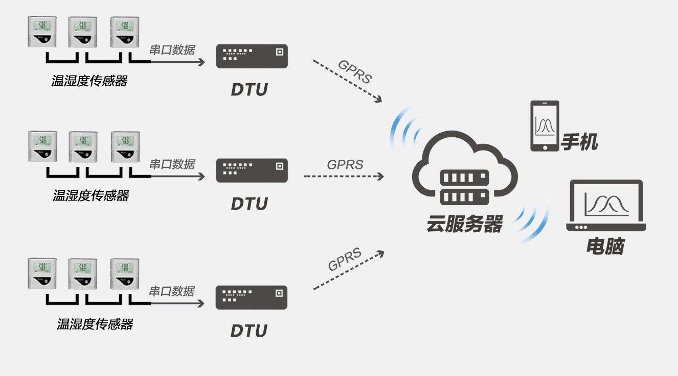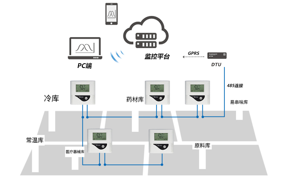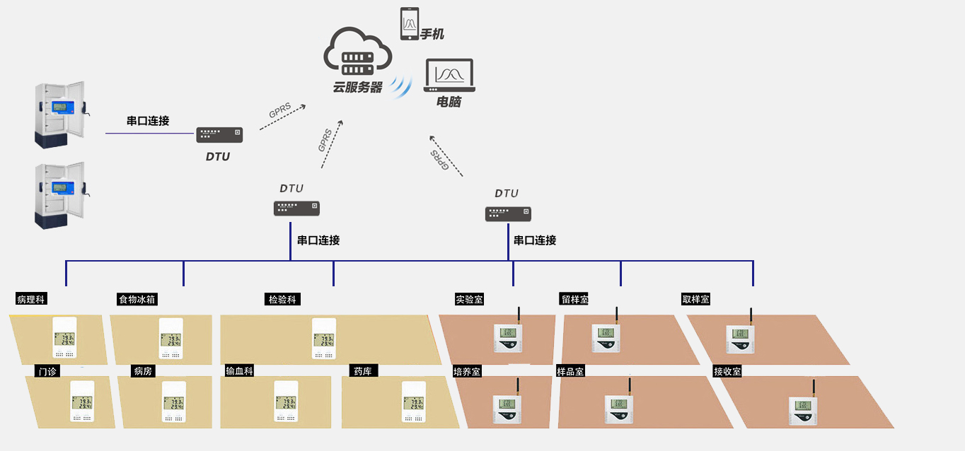 溫濕度監(jiān)測系統(tǒng)是利用DTU物聯(lián)網(wǎng)智能采集設(shè)備,對血車、血漿庫、保鮮庫、儲藏柜、冰箱、冷凍柜、醫(yī)院、機房、干燥箱等多點的溫度、濕度進行無線聯(lián)網(wǎng)監(jiān)測記錄,通過DTU物聯(lián)網(wǎng)智能采集設(shè)備將溫度、濕度數(shù)據(jù)傳輸?shù)捷x和科技云平臺,進行統(tǒng)一監(jiān)控、管理以報表、曲線等形式顯示出來,系統(tǒng)具有自動記錄存儲、打印曲線和報表、歷史數(shù)據(jù)查詢、自動報警等功能。