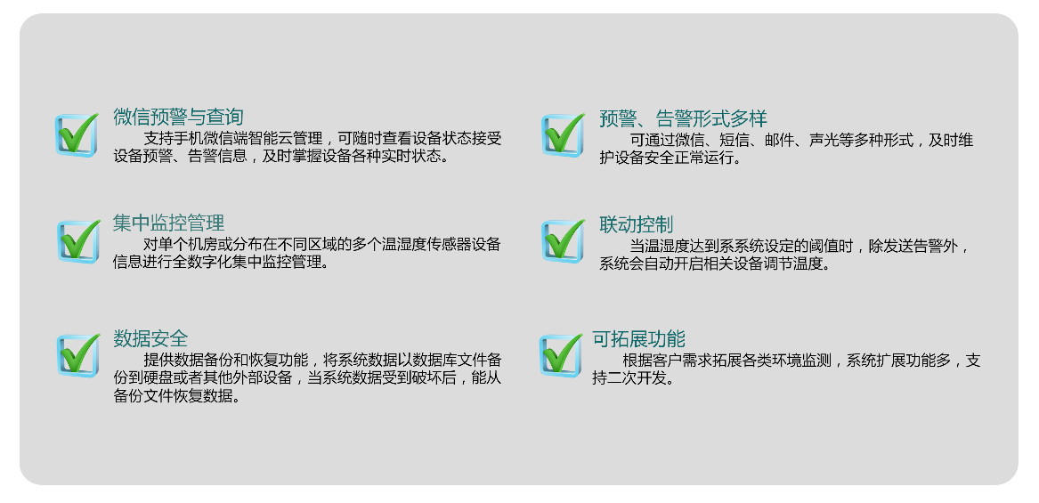 隨著信息技術(shù)的高速發(fā)展和普及,計算機系統(tǒng)及通信設(shè)備數(shù)量迅猛增加,機房(計算機中心、設(shè)備間、配線室、基站等)已經(jīng)成為各類企事業(yè)單位業(yè)務(wù)管理的核心平臺溫濕度監(jiān)測系統(tǒng)可以監(jiān)測機房是否保持在一個恒定的溫度范圍內(nèi),能夠有效避免溫度突然變化,為數(shù)據(jù)處理中心機房造成的損失。