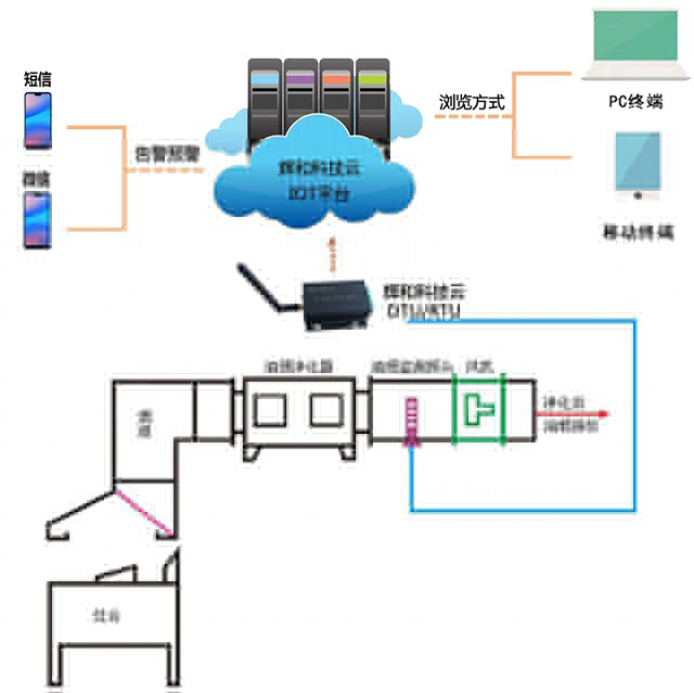 僅需輝和科技物聯網設備綜合管理系統1套、DTU物聯網采集設備和油煙傳感器若干,即可輕松實現油煙監測、數據采集、數據傳輸為一體的所有功能。