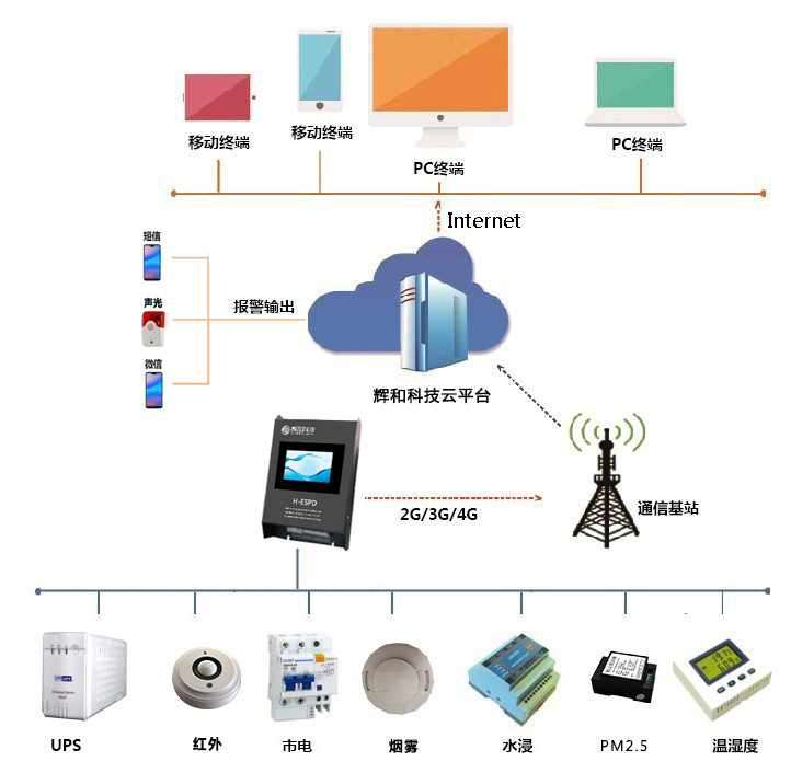 輝和智能微訊通防雷綜合管理系統是專門針對分布式監測的應用,通過GPRS專用網絡對散布在較大區域的大量機房或單個機房的物理安全及其內部的溫濕度、煙霧、紅外、漏水PM2.5等進行集中的監控。