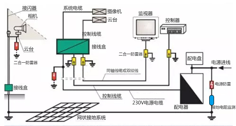 每年各種通訊控制系統或網絡因雷擊而受破壞的 事例屢見不鮮, 其中安防監控系統產品均為微電子產品,具有密度高、速度快、電壓低、功耗低等特點。它們對雷擊過電壓、電力系統運行過電壓、靜電放電、電磁輻射等各種電磁干擾非常敏感,使監測系統設備容易受到雷擊和過電壓損傷,其后果可能導致整個監測系統發生故障。它甚至會造成難以估計的經濟損失,危及人身安全。因此極有必要對這些設備進行防雷保護。