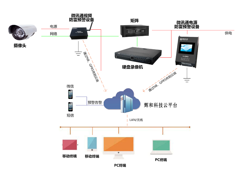 輝和微訊通防雷預警系統,由數據采集層 、信息傳輸以及應用管理平臺組成。