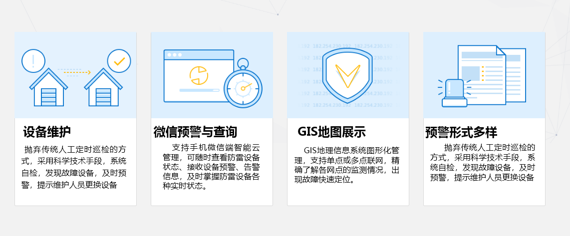 微訊通視頻防雷預警系統,宗旨“做真正長期有效防雷”打造國內物聯網防雷系統第一品牌,系統集物聯網主流技術研發,具有防雷防護、壽命預警、損壞告警、可擴展微信環境監測等功能,并可用微信實時查詢和接收預警、告警,通知維護管理人員及時維護以保證系統正常運行,減少用戶的維護成本、安全隱患和財產損失。將從以下這四個方面來對視頻監控系統進行防雷防護、故障預警。
