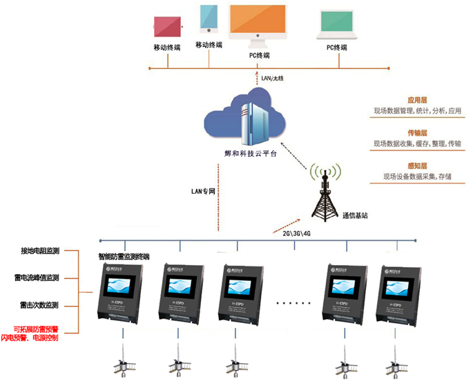 輝和科技避雷針防護診斷預警系統,由云端服務平臺、系統報警設備、前端采集設備組成。在現場安裝智慧防雷監測終端,通過GPRS通訊信號與輝和科技云平臺監控系統進行通訊。