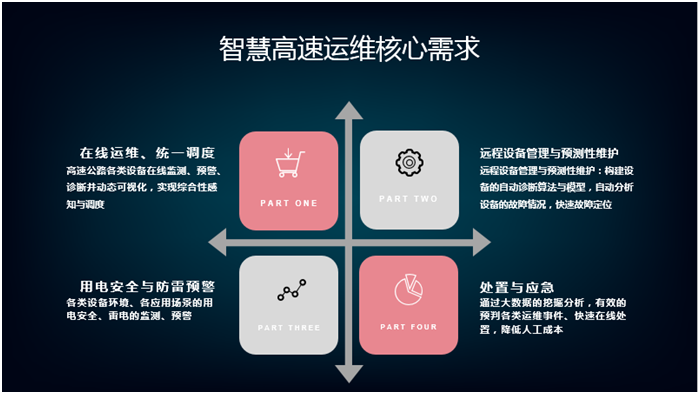 根據當前高速公路的現狀,運維核心需求是需要建立在線監測、分析、預警、調度與一體的綜合運維管理體系,實現各類設備的在線運維、統一調度、遠程設備管理與預測性維護、在線處置與應急,同時匹配道路監控、用電安全、防雷預警等各類應用場景,減少管理成本、提高安全效率、直接或間接降低、杜絕各類安全事件的發生。