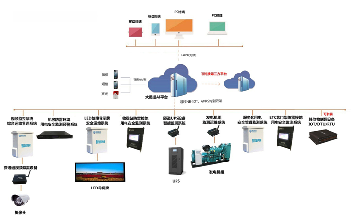 l 收費站及機房: 在收費站及機房內旁路部署安全運維管理設備,對收費站各類設備及機房環境等進行智能監測,包括雷擊次數、設備狀態、接地導通監測、漏流監測、漏電監測、遙信監測保障機房用電設備安全、可靠和不斷運行