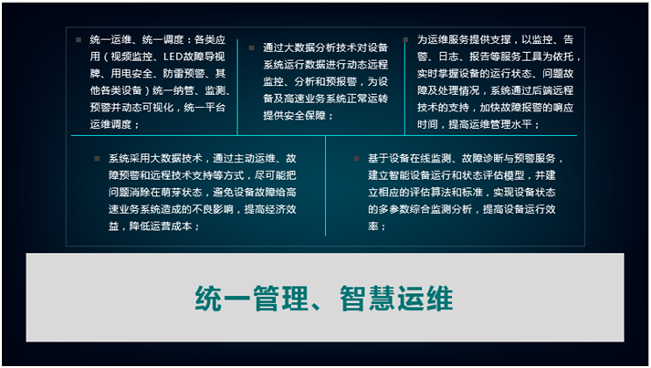 在線運維與統一調度:高速公路各類設備在線監測、預警、診斷并動態可視化,實現綜合性感知與調度。
