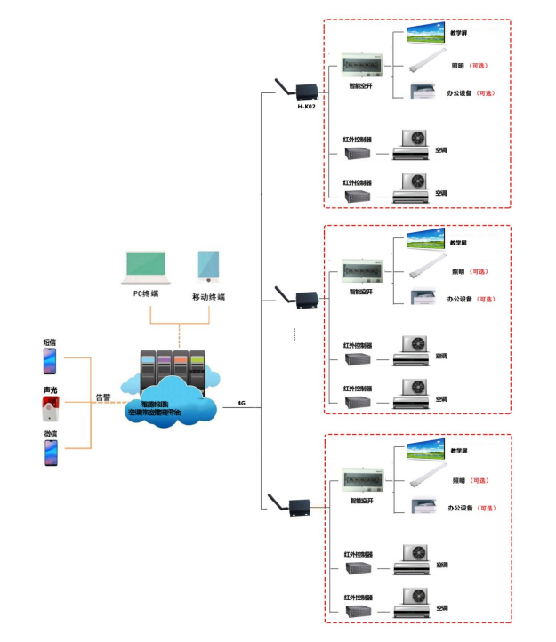 系統由輝和智能控制器(H-K02)、紅外空調控制器、智能空開和輝和GIS智能監測平臺共同構成,可掌握校園用電能耗的實時數據、對校園各用電系統進行分布式監控與集中管理。