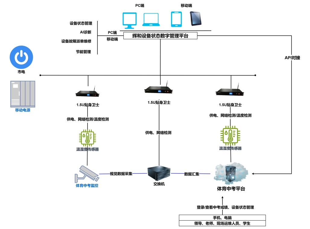 該解決方案結合數字化技術和供電保障措施,通過實時監控、數據分析、智能預警和應急處理等功能,為體育考試設備提供全方位的在線保障。該方案旨在提高設備運行的穩定性和可靠性,降低故障率,確??荚嚨墓?、公正和順利進行。平臺拓撲圖如下